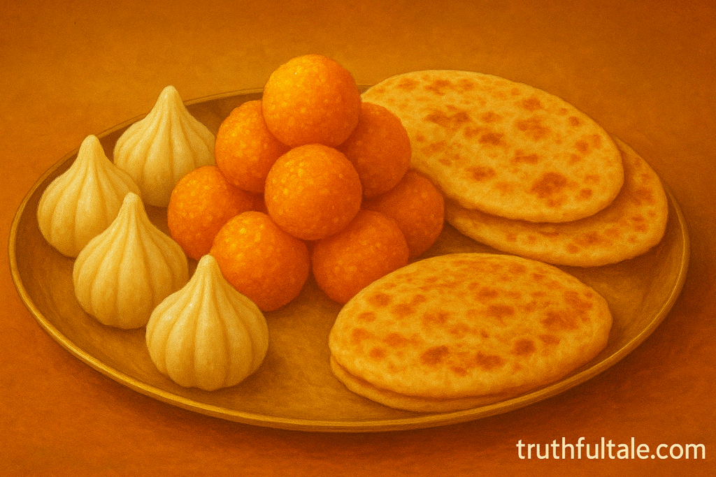 - Modak – sweet dumplings filled with coconut and jaggery, considered Ganesha’s favorite.