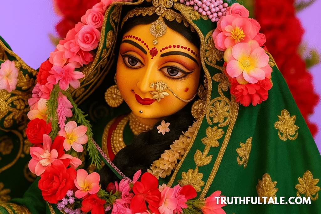 There are many beautiful legends about the birth of Radha Rani. One famous story says that she was not born like other children. She appeared in a lotus flower in a pond in a small village called Raval near Mathura. Vrishabhanu Ji, the village head, found her in that lotus and adopted her as his daughter. Her mother’s name was Kirtida.
