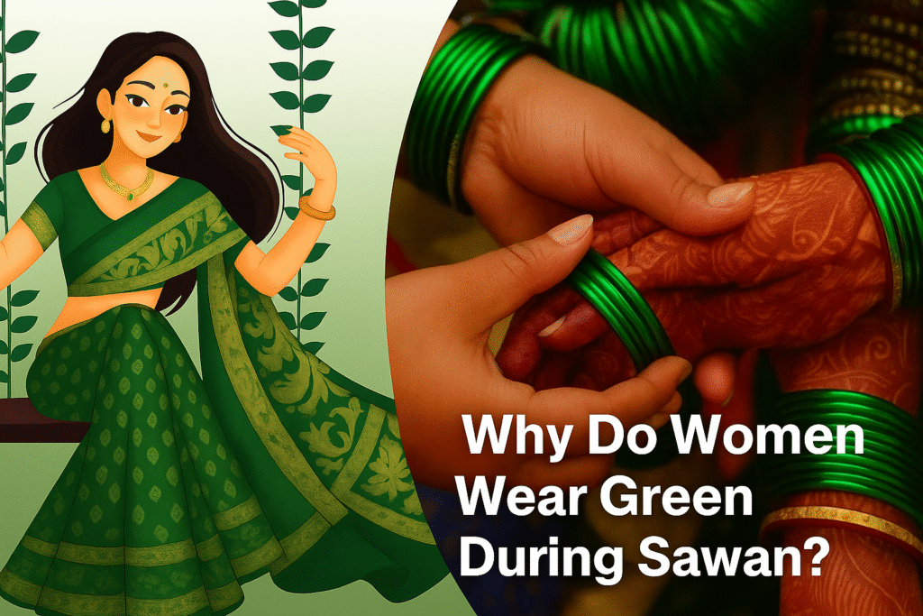 The month of Sawan (Shravan) is one of the most sacred months in the Hindu calendar. As the rains refresh the earth, hearts are filled with devotion — especially for Lord Shiva and Goddess Parvati. During this time, women, especially in North India, are seen adorned in green clothes, green bangles, bindis, and mehendi (henna). But have you ever wondered why green? Let’s explore the mythological, spiritual, and cultural reasons behind this beautiful tradition.